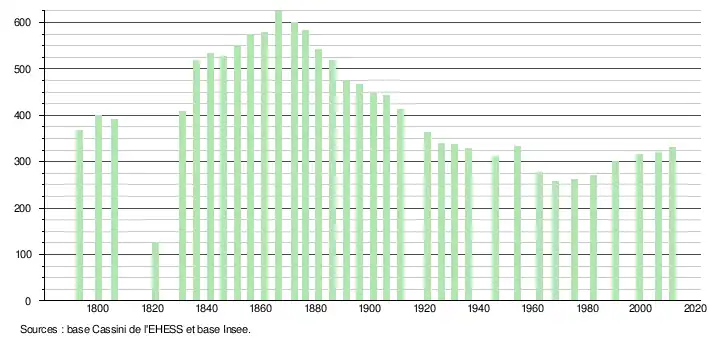 L'évolution du nombre d'habitants est connue à travers les recensements de la population effectués dans la commune depuis 1793. À partir du , les populations légales des communes sont publiées annuellement dans le cadre d'un recensement qui repose désormais sur une collecte d'information annuelle, concernant successivement tous les territoires communaux au cours d'une période de cinq ans. Pour les communes de moins de 10 000 habitants, une enquête de recensement portant sur toute la population est réalisée tous les cinq ans, les populations légales des années intermédiaires étant quant à elles estimées par interpolation ou extrapolation[4]. Pour la commune, le premier recensement exhaustif entrant dans le cadre du nouveau dispositif a été réalisé en 2006[5],[Note 1].