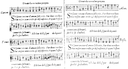 - Le contenu de tous ces volumes est comparé dans Guillo 1991 p. 76-79. Le livre est entièrement transcrit dans la thèse de Marc Honegger de 1970, non publiée. Le volume met en musique des pièces dues au poète Guillaume Guéroult ; il contient notamment sa chanson spirituelle Susanne un jour d’amour sollicitée qui connaîtra un succès considérable jusqu’au milieu du XVIIe siècle, tant pour le texte que pour la musique, puisqu’on connaît une quarantaine de reprises de ce texte par une trentaine de compositeurs, la moitié environ reprenant même le thème de la composition de Lupi[1]. Outre cette chanson et les autres chansons spirituelles, l’ouvrage inclut 5 psaumes en français, un Te Deum et des Lamentations. Il mêle un style homophonique, très vertical, et un style plus élaboré, plus "motetique", avec des imitations fréquentes d’une voix à l’autre. L’édition de 1548 figure aussi la première apparition d’un livre de chœur de petit format, dans lequel les quatre voix sont disposées en regard.