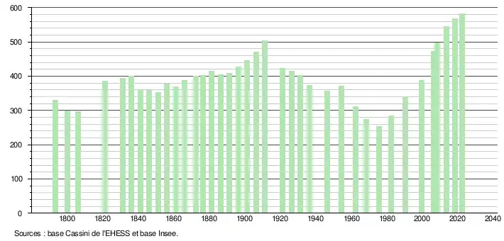 L'évolution du nombre d'habitants est connue à travers les recensements de la population effectués dans la commune depuis 1793. Pour les communes de moins de 10 000 habitants, une enquête de recensement portant sur toute la population est réalisée tous les cinq ans, les populations de référence des années intermédiaires étant quant à elles estimées par interpolation ou extrapolation[30]. Pour la commune, le premier recensement exhaustif entrant dans le cadre du nouveau dispositif a été réalisé en 2008[31].