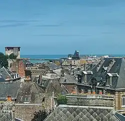 De haut en bas et de gauche à droite : panorama de la ville, les arcades de la Bourse, l'église St-Jacques, le café des Tribunaux, la Porte de Dieppe, le port de plaisance, le château, panorama du port.