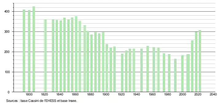 L'évolution du nombre d'habitants est connue à travers les recensements de la population effectués dans la commune depuis 1793. Pour les communes de moins de 10 000 habitants, une enquête de recensement portant sur toute la population est réalisée tous les cinq ans, les populations de référence des années intermédiaires étant quant à elles estimées par interpolation ou extrapolation[17]. Pour la commune, le premier recensement exhaustif entrant dans le cadre du nouveau dispositif a été réalisé en 2007[18].