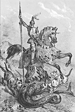 La légende de Bosio[9], reprise dans la traduction en français de Boyssat en 1612, indique que « le Dragon estoit de la grosseur d'un cheval moyen, la teste de serpent, les oreilles de mulet couvertes de peau fort dure et escailles, les dents fort aigus, la gorge grande, les yeux caves luysans comme feu, avec un regard effroyable, quatre jambes comme un Crocodil, les griffes fort dures et aigues ; sur le dos deux petites aisles, dessus de couleur d'un Dauphin, dessous jaunes et verdes comme estoit le ventre, et la queue comme un Lezart[10]. »