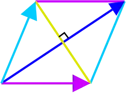 La preuve est identique. Pour le cas particulier où a et b ont des normes égales (ce qui signifie leurs produits scalaires sont égaux, car ), cela démontre analytiquement le fait que deux diagonales d'un losange sont perpendiculaires. Cela découle du fait que le membre de gauche de l'équation est égal à zéro, nécessitant que le membre de droite soit également égal à zéro, et donc le produit scalaire de la somme vectorielle de a + b (la longue diagonale du losange) avec la différence vectorielle a - b ( la petite diagonale du losange) doit être égal à zéro, ce qui indique que les diagonales sont perpendiculaires.