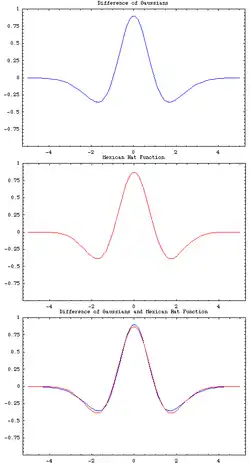 La différence de gaussiennes est une ondelette mère de somme totale nulle qui approche l'ondelette chapeau mexicain en soustrayant une gaussienne large d'une gaussienne étroite, comme défini dans cette formule dans le cas d'une dimension :