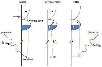 Le RIXS peut être considéré comme un processus en deux étapes. À partir de l'état initial, l'absorption d'un photon incident crée un état excité intermédiaire qui se caractérise par un trou de cœur. À partir de cet état, l'émission d'un photon fait passer dans l'état final. Pour simplifier, le processus d'absorption permet d'obtenir des informations sur les états électroniques non occupés, tandis que l'émission donne des informations sur les états occupés. Dans les expériences RIXS, ces deux informations se combinent, fortement perturbées par le potentiel de trou de cœur dans l'état intermédiaire.