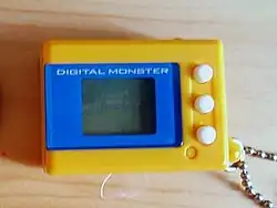 Pour redynamiser les ventes au Japon lors du développement de la seconde génération de Tamagotchi[87], des discussions sont entamées sur la création d'un Tamagotchi à destination des jeunes garçons[88],[89], et dans cet esprit, « qui peut se battre »[90],[91],[92]. Ainsi, la franchise Digimon naît de ce phénomène des animaux de compagnie virtuels avec le Digital Monster (デジタルモンスター), le 1er virtual pet Digimon directement dérivé du Tamagotchi et développé par le même département de chez Bandai[93],[94] durant l'année 1996 puis présenté officiellement au Tokyo Toy Show en mars 1997[87],[95]. Les principaux acteurs du développement de ce gadget sous un pseudonyme commun, « Akiyoshi Hongo »[96], sont Makoto Kitagawara et Kenji Watanabe de la société WiZ et Ayumu Horimura de Bandai[88],[89].