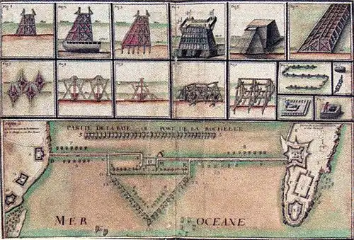 Richelieu donne son accord pour le projet, et 4 000 ouvriers grassement rémunérés, dont beaucoup de soldats et des maçons de la Creuse, se mettent immédiatement à l’œuvre. S’appuyant sur des navires coulés et préalablement maçonnés, la digue fait 1 500 mètres de longueur. Large de 16 mètres à la base (8 toises) et de 8 mètres à son sommet (4 toises), elle est haute de 20 mètres, et armée de canons pointés vers le large, afin d’empêcher le ravitaillement par mer.