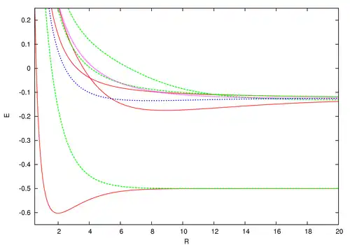 Les énergies pour les états discrets les plus bas sont illustrées dans la figure ci-contre. Celles-ci peuvent être obtenues à la précision arbitraire désirée avec le calcul formel de la généralisation de la fonction W de Lambert (voir l'équation de ce site et la référence de Scott, Aubert-Frécon et Grotendorst) mais furent calculées au départ par des moyens numériques avec le programme ODKIL[8]. Les lignes pleines rouges correspondent aux états . Les lignes pointillées vertes sont les états . La ligne pointillée bleue est l'état et la ligne pointillée rose est l'état . Quoique les solutions provenant de la généralisation de la fonction W de Lambert dépassent les développements asymptotiques, en pratique, elles sont plus utiles près de la distance d'équilibre.