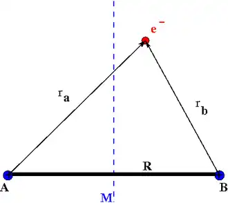 La version la plus simple de l'équation de Schrödinger pour la fonction d'onde électronique de l'ion moléculaire d'hydrogène H2+ est modélisée avec deux noyaux fixes, A et B, et un électron. Elle est écrite selon :