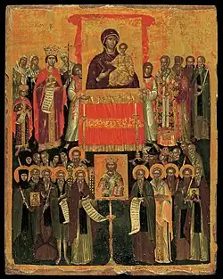 En 730, l'empereur Léon III interdit la vénération des icônes et ordonna leur destruction. Parmi les défenseurs des icônes, il faut mentionner l'important théologien Jean Damascène. L'impératrice Irène, belle-fille de Léon III, réunit le Deuxième concile de Nicée (ou « septième concile » – dernier concile reconnu par l'Église orthodoxe, d'où le nom d'Églises des sept conciles) à Nicée en 787. Les persécutions reprirent cependant, après la mort de l'impératrice, sous les règnes de Nicéphore Ier et de Michel Ier. L'empereur Léon V, puis l'empereur Théophile continuèrent à s'opposer aux icônes et à persécuter leurs défenseurs. L'empereur Théophile étant gravement atteint de dysenterie, son épouse Théodora eut en songe que la Mère de Dieu « tenant entre ses bras le Dieu d'avant les siècles, entourée d'anges resplendissants, blâmaient et châtiaient Théophile son époux »[2]. À la suite de cette vision, Théophile se repentit de son action peu avant sa mort ; son épouse autorisa le culte des icônes et avec l'aide du patriarche Méthode, elle rétablit à leur rang les moines jusque-là persécutés.