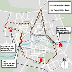 Les avis divergent en ce qui concerne le parcours exact de la manifestation : Kurt Lindner[5], qui dirigeait une conférence du KPD sur les prochaines élections du Reichstag dans le gymnase des ouvriers ce jour-là, parle de deux cortèges de manifestants convergeant vers les bâtiments. Le gymnase de la Zeissingstrasse est attaqué par un cortège venant du sud. Le « bâtiment de la lutte des classes » à Breite Weg est attaqué par un deuxième cortège venant du nord. Les deux bâtiments sont reliés par une cour commune. Au moment de l'attaque, des responsables du KPD, une garde composée de 15 à 20 athlètes fréquentant le gymnase et une trentaine de jeunes de 13 à 14 ans se trouvent dans les bâtiments. Un événement est prévu pour les jeunes fréquentant le gymnase, dans l' après-midi dans le cadre de la Jugendweihe (de), fête laïque calquée sur le modèle de la confirmation chrétienne. Selon les constatations du tribunal de grande instance de Halle dans un jugement rendu le 3 août 1949[6] un cortège de manifestants mêlant deux groupes SS et un groupe SA s'est formé au point de rendez-vous. La plupart des participants sont équipés de pistolets, de pelles ou de pioches. Au cours de la marche à travers Eisleben, les membres des SA et des SS ont déchiré les insignes des organisations antifascistes des vêtements des passants. À Kreisfelder Gasse, les participants à cette manifestation font irruption dans l'appartement d'un antifasciste bien connu et saccagent l'habitation. En venant d'Annengasse, la manifestation est passée devant le « bâtiment de la lutte des classes » puis via Kasseler Straße a atteint Zeißingstraße et son gymnase. L'attaque contre le complexe de bâtiments se déroule simultanément des deux côtés : lorsque la tête du cortège attaque le gymnase, la queue s'en prend au siège du KPD.