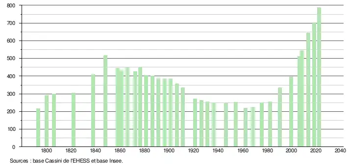 L'évolution du nombre d'habitants est connue à travers les recensements de la population effectués dans la commune depuis 1793. Pour les communes de moins de 10 000 habitants, une enquête de recensement portant sur toute la population est réalisée tous les cinq ans, les populations de référence des années intermédiaires étant quant à elles estimées par interpolation ou extrapolation[9]. Pour la commune, le premier recensement exhaustif entrant dans le cadre du nouveau dispositif a été réalisé en 2008[10].