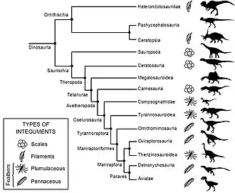 La plupart des dinosaures non aviens connus pour avoir eu des plumes ou des protoplumes sont des théropodes, plus particulièrement appartenant au clade des Coelurosaures. Toutefois, des structures tégumentaires filamenteuses ont été observées chez certains dinosaures non théropodes, tels les ornithischiens Tianyulong et Psittacosaurus. La nature exacte de ces structures fait l'objet de débats, Tianyulong portant de simples filaments relativement rigides[27],[28]. Un autre ornithischien, Kulindadromeus, s'est révélé porteur de structures plus complexes[29],[30].