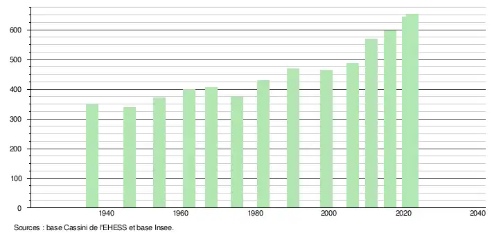 - ↑ Population municipale de référence en vigueur au 1er janvier 2025, millésimée 2022, définie dans les limites territoriales en vigueur au 1er janvier 2024, date de référence statistique : 1er janvier 2022.