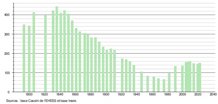 L'évolution du nombre d'habitants est connue à travers les recensements de la population effectués dans la commune depuis 1793. Pour les communes de moins de 10 000 habitants, une enquête de recensement portant sur toute la population est réalisée tous les cinq ans, les populations de référence des années intermédiaires étant quant à elles estimées par interpolation ou extrapolation[22]. Pour la commune, le premier recensement exhaustif entrant dans le cadre du nouveau dispositif a été réalisé en 2004[23].