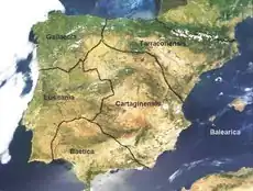 - Tarraconaise (Hispania Tarraconensis, de -27 à 459) : Aragon, Asturies, Cantabrie, Catalogne, Castille-La Manche, Castille-et-León, Galice, Madrid, La Rioja, Murcie, Navarre, Pays basque, Valence, et Andalousie de l'Est, administrée depuis Tarragone (Tarraco)