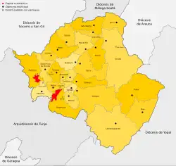 Le siège épiscopal est dans la ville de Duitama où se trouve la cathédrale Saint-Laurent (es). La cocathédrale Saint-Martin est à Sogamoso. La basilique mineure de Notre-Dame de Monguí[1]abrite une image représentant la Sainte Famille lors d'une halte pendant la Fuite en Égypte[2].