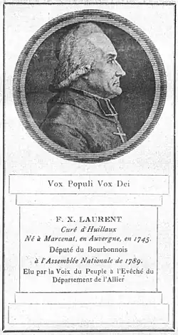 - ↑ Joseph Viple, « François-Xavier Laurent, député à l'Assemblée constituante, évêque constitutionnel du département de l'Allier (1744-1820) », Bulletin de la Société d'émulation du Bourbonnais, 1920, p. 11-63. En fait, il est mort à Clermont-Ferrand le 1er mai 1821.