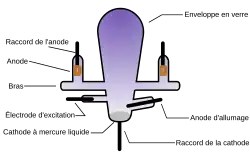 Les premières diodes étaient réalisées dans une enveloppe mise sous vide dont on avait rempli le fond avec du mercure[6]. L'ampoule permet de faire condenser la vapeur formée lors du fonctionnement de l'appareil. L'enveloppe de verre possède un à plusieurs bras dans lesquels sont disposées des barres de graphite, qui servent d'anode. Leur nombre dépend de l'application, en général chaque phase est associée à une anode. La géométrie de l'enveloppe doit permettre au mercure qui se condense de retourner rapidement dans la piscine afin d'éviter la formation d'un chemin conducteur entre l'anode et la cathode.