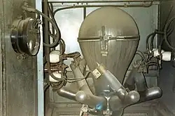 Vue en coupe d'une diode à vapeur de mercure à cuve d'acier de première génération. Son courant nominal est 30 A, sa tension nominale 50 kV.