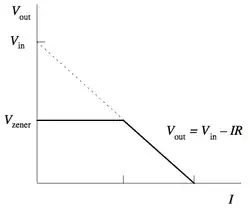 - R doit être suffisamment petite pour que le courant qui passe dans D la maintienne en mode d'avalanche. La valeur de ce courant est donnée dans la data sheet de D. Par exemple, la diode Zener classique BZX79C5V6[7] (5,6 V / 0,5 W) possède un courant inverse recommandé de 5 mA. Si le courant qui traverse D n'est pas suffisant, alors UOUT n'est pas régulé, et vaut moins que la tension d'avalanche (ce comportement est différent de celui des tubes régulateurs de tension pour lesquels la tension de sortie serait supérieure à la tension nominale, et pourrait atteindre UIN). Lors du calcul de R, on doit tenir compte du courant qui circule dans la charge externe connectée sur UOUT (qui ne figure pas dans ce diagramme) ;