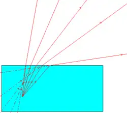 Une des conséquences des lois de Snell-Descartes est que le dioptre plan est un système non-stigmatique. L'illustration ci-dessus montre que la lumière issue d'un point placé dans un aquarium, par exemple, donne des rayons réfractés dans l'air qui ont des directions sans point commun.