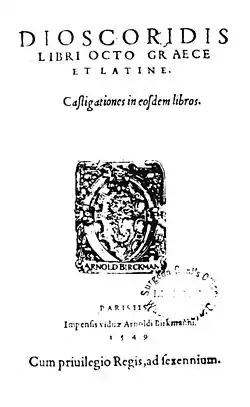 - ↑ (la) Pedanius Dioscorides (trad. Jean Ruel (1479-1537)), Pedanii Dioscoridis Anazarbei, De medicinali materia libri sex, Lyon, chez Balthazar Arnoullet, (lire en ligne)
