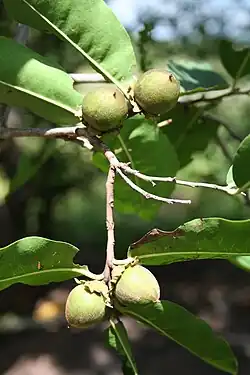 L'arbre femelle porte des fruits pendant la saison sèche et ceux-ci sont mangés par de nombreux animaux sauvages; ils sont de forme ovale, jaunes ou violets à maturité et d'environ 20–30 mm de diamètre. Les fruits restent incrustés dans les lobes persistants du calice. Le fruit contient de trois à six graines brun rougeâtre. L'intérieur des grosses graines peut également être consommé, il a un goût de noisette.