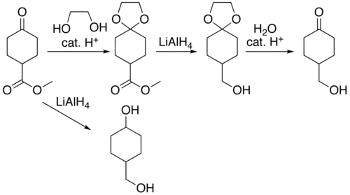 Certains composés organiques contenant des groupes carbonyles ont besoin parfois que ces groupes soient protégés pour éviter qu'ils ne réagissent lors de réactions destinées à modifier d'autres fonction- nalités de ces composés. À cet effet, plusieurs approches de protection et de déprotection[9] en particu- lier via des dioxolanes[10] sont connues. Par exemple, la réduction du 4-oxocyclohexanecarboxylate de méthyle avec l'aluminohydrure de lithium (LiAlH4) génère le 4-hydroxyméthylcyclohexanol. En proté- geant la cétone par un cétal, il est possible de ne réduire que la fonction ester. Ce cétal est produit par la réaction de la molécule de départ avec l'éthylène glycol, catalysée par un acide. Puis la réduction est effectuée et finalement par déprotection par hydrolyse, la 4-hydroxyméthylcyclohexanone est obtenue :