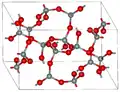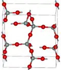 Les fibres de silice présentent une structure semblable à celle du disulfure de silicium SiS2, avec des chaînes de tétraèdres partageant certaines de leurs arêtes. La stishovite, forme stable à haute pression, présente en revanche une structure de type rutile, dans laquelle les atomes de silicium sont hexacoordonnés. La masse volumique de la stishovite est de 4,287 g·cm-3, bien supérieure à celle du quartz α, qui n'est que de 2,648 g·cm-3[20]. Cette différence de masse volumique est à mettre en relation avec la variation de coordinence, car les liaisons Si–O sont plus longues dans la stishovite — quatre liaisons équatoriales de 176 pm et deux liaisons polaires de 181 pm — que dans le quartz α : quatre liaisons tétraédriques de 161 pm[21].