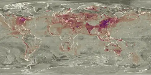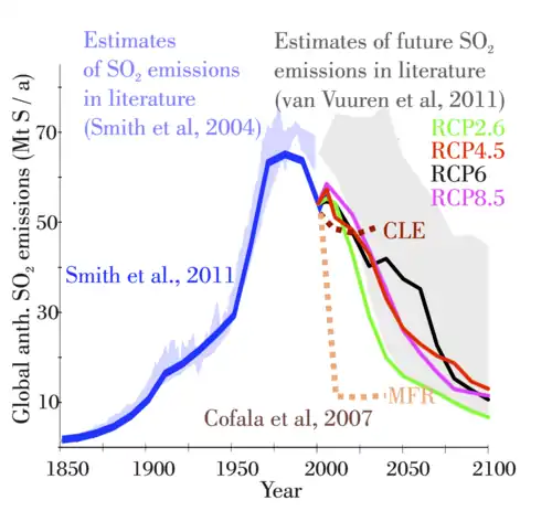Le dioxyde de soufre est l'un des polluants majeurs de l'atmosphère depuis le début de la révolution industrielle, en raison des grandes quantités de charbon, puis de pétrole et de gaz brûlés par les humains, essentiellement dans l'hémisphère nord. Il a des effets significatifs sur la santé publique[22] et est un des responsables des smogs qui affectent les grandes villes industrialisées. Les impacts furent particulièrement sévères au début et milieu du XXe siècle dans les grandes villes européennes (Londres en particulier avec le Grand smog de Londres). Il est désormais un phénomène courant dans les mégapoles asiatiques.
