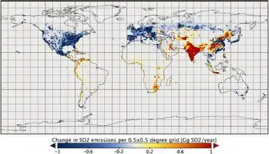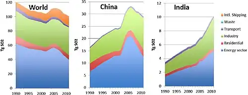 En 2006, la Chine était le plus grand pollueur au dioxyde de soufre au monde, en grande partie pour produire des biens de consommation utilisés dans d'autres pays (« émissions grises »). En 2005, les émissions chinoises étaient estimées à 23,1 Mt, presque comparables à celles des États-Unis en 1980, et étaient en forte augmentation (croissance de plus de 27 % en cinq ans de 2000 à 2005)[28]. Pour moins subir les retombées acides de la Chine, le Japon a décidé en 2007 de l'aider à développer les énergies propres[29].