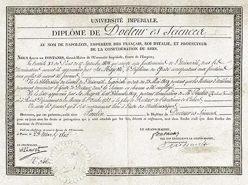 Après la Révolution française qui supprime les universités, c'est tout d'abord dans les disciplines de la médecine et du droit que le doctorat est rétabli en même temps que les écoles de médecine, par la loi du 19 ventôse an XI () pour la médecine[2], et la loi du 22 ventôse an XII () pour le droit, à l'occasion de la création des écoles de droit. Dès 1806, six docteurs en droit sont ainsi reçus[3]. Après la création de l'Université impériale en 1806, le décret du qui en fixe l'organisation, conserve les doctorats en droit et en médecine et y ajoute le doctorat ès sciences, le doctorat ès lettres, et le doctorat en théologie.