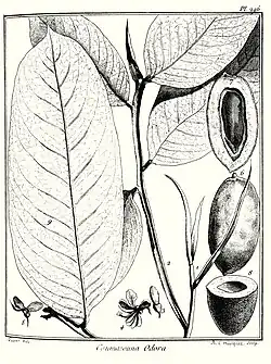 L'ovaire devient une baie ovoïde. Son écorce eſt jaunâtre, charnue, filandreuſe, épaiſſe, adhérente a un noyau dur, ſec, qui contient une amande blanche, enveloppée d'une membrane rouſſâtre. Cette amande exhale une odeur amère & très agréable. Les naturels enfilent les amandes, & s'en forment des colliers pour ſe parfumer. Les Créoles en mettent dans leurs armoires, pour les préſerver des inſectes, & leur communiquer une bonne odeur.