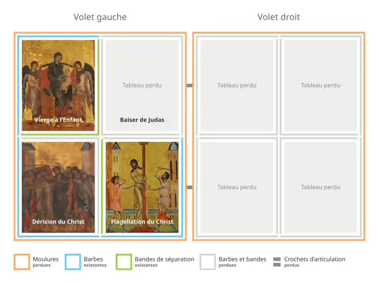 Les tableaux sont dissociés et dispersés probablement au XIXe siècle pour entrer individuellement sur le marché de l'art. Le premier à réapparaître est La Flagellation du Christ. Il est conservé depuis 1950 à la Frick Collection de New York sous le numéro d'inventaire 50.1.159[3]. La Vierge à l'Enfant trônant et entourée de deux anges est redécouverte en 2000. L'œuvre est conservée depuis lors à la National Gallery de Londres[2]. Le Christ moqué, un troisième tableau supposé appartenir au même Diptyque, est découvert dans une collection privée près de Compiègne en 2019 et est proposé à la vente aux enchères le 27 octobre 2019[1] à Senlis, par la maison de ventes Actéon. Estimé par le commissaire-priseur entre 4 et 6 millions d’euros, le petit panneau de peuplier a vu son prix s’envoler pour atteindre, en moins de 10 minutes, la somme phénoménale de 24 180 000 d’euros (19,5 millions d’euros au marteau, plus 4,68 millions d’euros de taxes), soit 4 fois plus que son estimation haute. Le 23 décembre 2019, un arrêté refusant le certificat d’exportation pour ce panneau de Cimabue, lui conférant ainsi le statut de « trésor national » pour une période de trente mois qui s’ouvre à compter de la notification de cette décision au propriétaire du tableau[5],[6],[7].