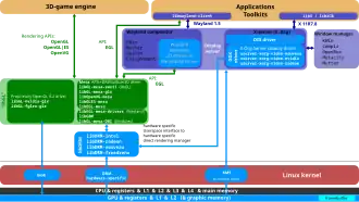 Dans le kernel 3.12, les nœuds de rendu ont été fusionnés et KMS a été éclaté. Wayland implémente le rendu direct par-dessus EGL.
