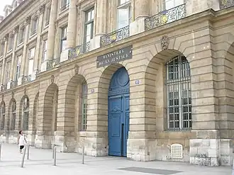 Entrée du ministère de la Justice au 13 place Vendôme, 1er arrondissement de Paris, où se situe la direction des Affaires criminelles et des Grâces.