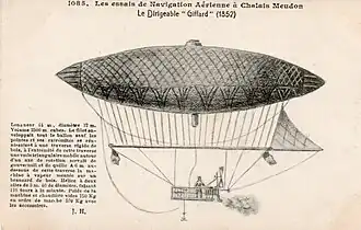 Au milieu du XIXe siècle, l'Aérostat Giffard marque une étape très importante de l'évolution des aérostats, intermédiaire entre les ballons de type montgolfière et les dirigeables modernes : c'est un ballon rempli d'hydrogène, de forme oblongue, pourvu d'une hélice actionnée par un petit moteur à vapeur et d'un gouvernail[4]. En 1884, le dirigeable la France est le premier à effectuer des vols en circuits fermés. Il est pourvu d'un moteur électrique. Il préfigure les dirigeables à enveloppe souple du XXe siècle[5].