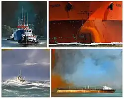- la marine marchande (cargos, remorqueurs, ...) et notamment les ports industriels (les grues de chantier entourant l'Aquacharm dans Naissance) ou les portraits de bateaux (Abeille Bourbon, ou le gros plan sur l'étrave rouge du Nordic Torinita),