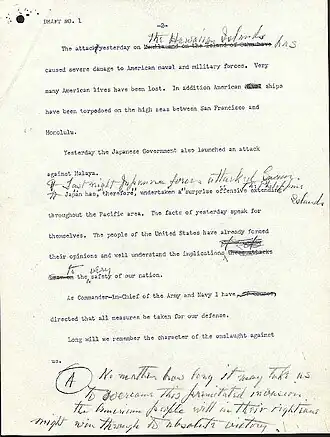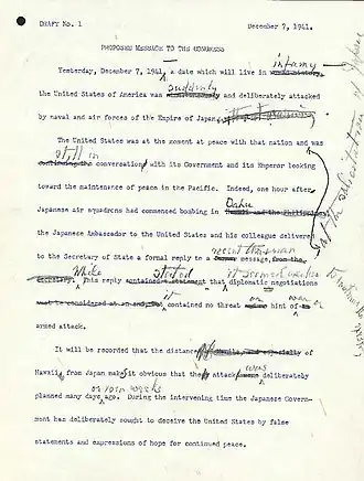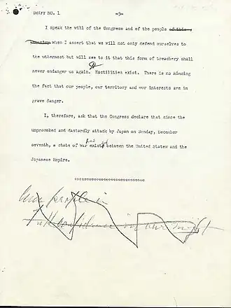 « Yesterday, December 7, 1941 a date which will live in infamy the United States of America was suddenly and deliberately attacked by naval and air forces of the Empire of Japan.The United States was at peace with that Nation and, at the solicitation of Japan, was still in conversation with its Government and its Emperor looking toward the maintenance of peace in the Pacific. Indeed, one hour after Japanese air squadrons had commenced bombing in the American Island of Oahu, the Japanese Ambassador to the United States and his colleague delivered to our Secretary of State a formal reply to a recent American message. And while this reply stated that it seemed useless to continue the existing diplomatic negotiations, it contained no threat or hint of war or of armed attack.