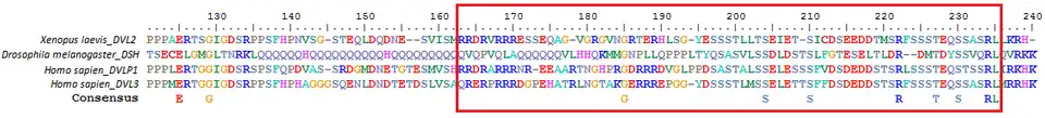 - Une séquence d'exportation nucléaire (NES) bien conservée en C-terminal. Elle assure le déplacement de la Dvl du noyau vers le cytoplasme[4].