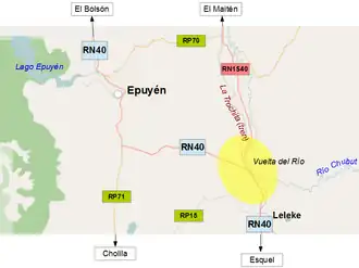Le , une communauté mapuche appartenant au Movimiento Mapuche Autónomo del Puel Mapu (MAP) établit un lof (=communauté) nommé « Pu Lof en Resistencia » dans le domaine Leleque, sur le terrain situé au lieu-dit Vuelta del Río, le long de la Route nationale 40 et sur le cours supérieur du río Chubut, entre les localités de Cholila et d’Esquel[26],[27],[28].