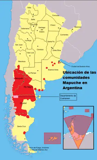 Les communautés mapuches contemporaines revendiquent la propriété ancestrale des différents territoires qui historiquement appartenaient à leurs ancêtres, tant en Argentine que dans le Chili voisin. En Argentine, ils obtinrent leurs plus grands succès dans la province de Neuquén, où un grand nombre de territoires leur ont été attribués (« réserves »), pour la plupart sis dans la région de la Route des Sept Lacs[20],[21]. Dans les provinces limitrophes de Río Negro et de Chubut, en revanche, la reconnaissance de leurs droits sur les terres a été moindre, ce qui a provoqué une série de conflits de basse intensité, portant sur l’exigence que leurs droits territoriaux constitutionnels soient reconnus par les autorités nationales et provinciales, en particulier sur des étendues occupées par des parcs nationaux et par de grandes propriétés terriennes.