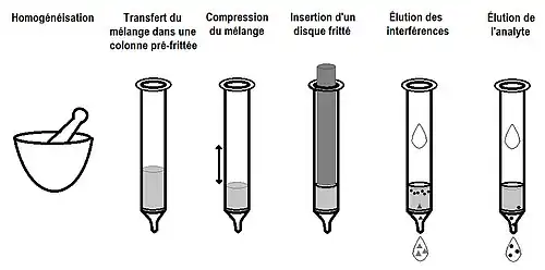 - prétraitement de l’échantillon : une petite quantité d’échantillon est placée dans un mortier de vitre et on y ajoute le sorbant. Le rapport de l’échantillon par rapport au sorbant est normalement de 1 : 4. À la fin de cette étape, le mélange obtenu devrait être lisse, sèche et devrait avoir l’apparence d’une poudre fluide. Cette étape nécessite entre trente secondes et une minute[5]. Après avoir effectué le broyage, le mélange est transféré dans une colonne de MSPD pré-frittée au fond et est compressé. On insère ensuite un deuxième fritté au sommet de la colonne ;