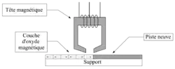 Un bit est positionné ou pas suivant le sens de l’orientation des micro-particules d’oxyde magnétique, dans un sens, le bit est lu comme un « 0 » logique, et dans l’autre sens comme un « 1 » logique. Pour l’écriture, la tête impose un sens aux micro-particules grâce à un champ magnétique créé avec une bobine ou l’autre suivant le sens que l’on veut donner au bit écrit.