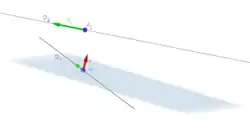 Comme et sont gauches, elles admettent une unique perpendiculaire commune , qui coupe en et en . La longueur est également la distance [1]. Pour trouver ces points il faut combiner les propriétés suivantes :