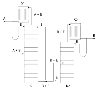 La distillation extractive utilise un additif, appelé agent d'entraînement, qui augmente la volatilité de l'un des composants ou modifie fortement les coefficients d'activité des substances à séparer dans des directions différentes et donc le facteur de séparation devient nettement différent de 1 (1 = azéotrope) :