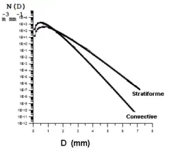 L'étude la plus connue sur le sujet est celle de Marshall et Palmer faite à l'Université McGill de Montréal en 1948[2],[4]. Ils ont trouvé une distribution des gouttes dans la pluie stratiforme dont le , ce qui revient à une distribution exponentielle. Cette « distribution de Marshall-Palmer » s'écrit alors :