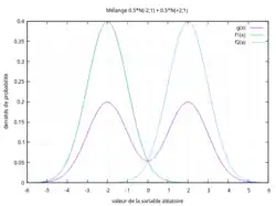 - Une distribution unimodale (courbe verte, dont l'abscisse du mode est située à environ -1) d'occurrence 40% et d'une distribution unimodale (courbe bleue, dont l'abscisse du mode vaut 1) d'occurrence 60%.