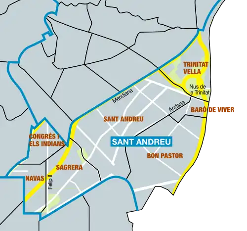 Il est composé des sept quartiers suivants : Trinitat Vella, Baró de Viver, Bon Pastor, Sant Andreu de Palomar, La Sagrera, El Congrés i els Indians et Navas.